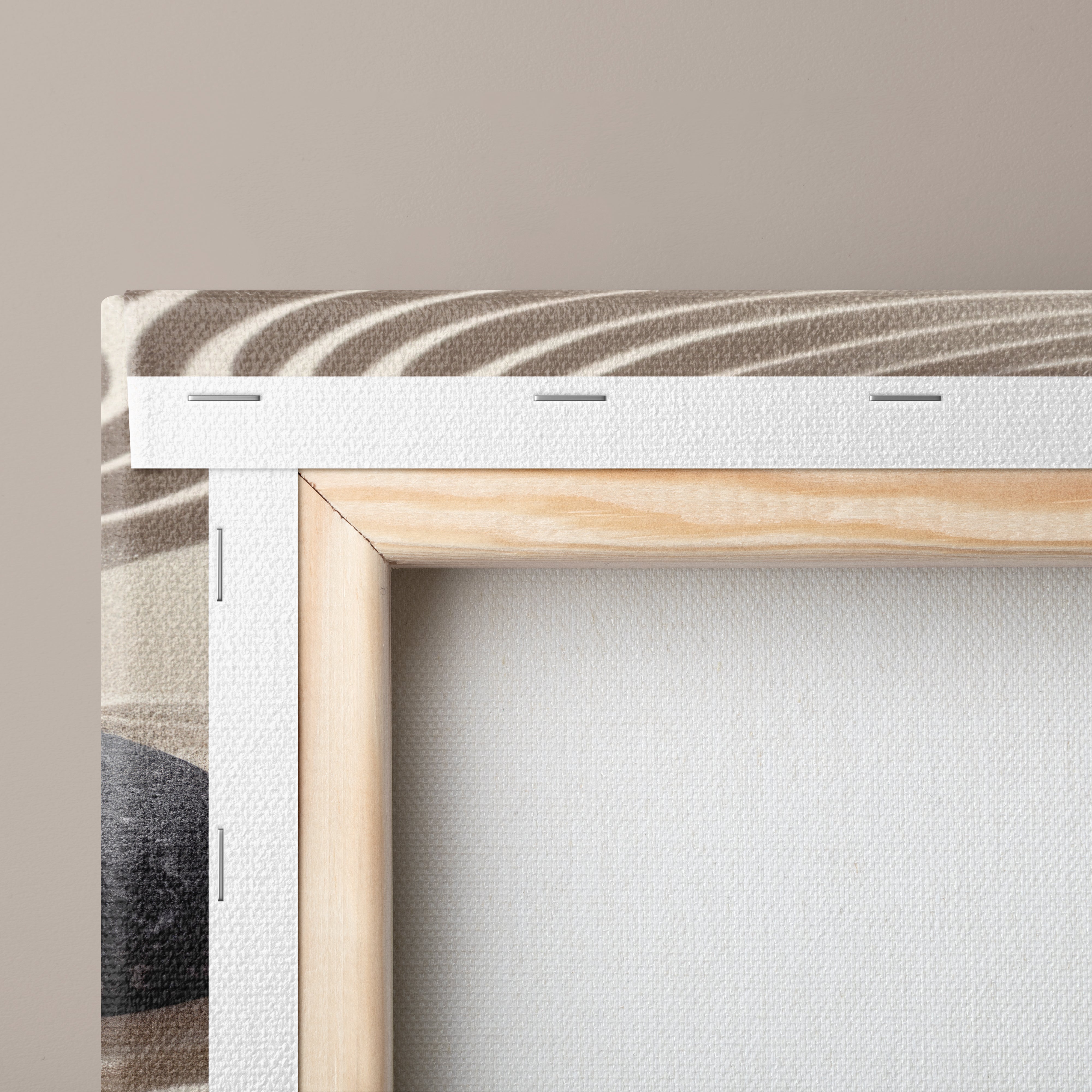 Each canvas is tightly folded and stapled on finger-jointed knotless European pine stretcher bars, with wedges for tension, using sustainably sourced wood for enduring strength and eco-friendly quality.