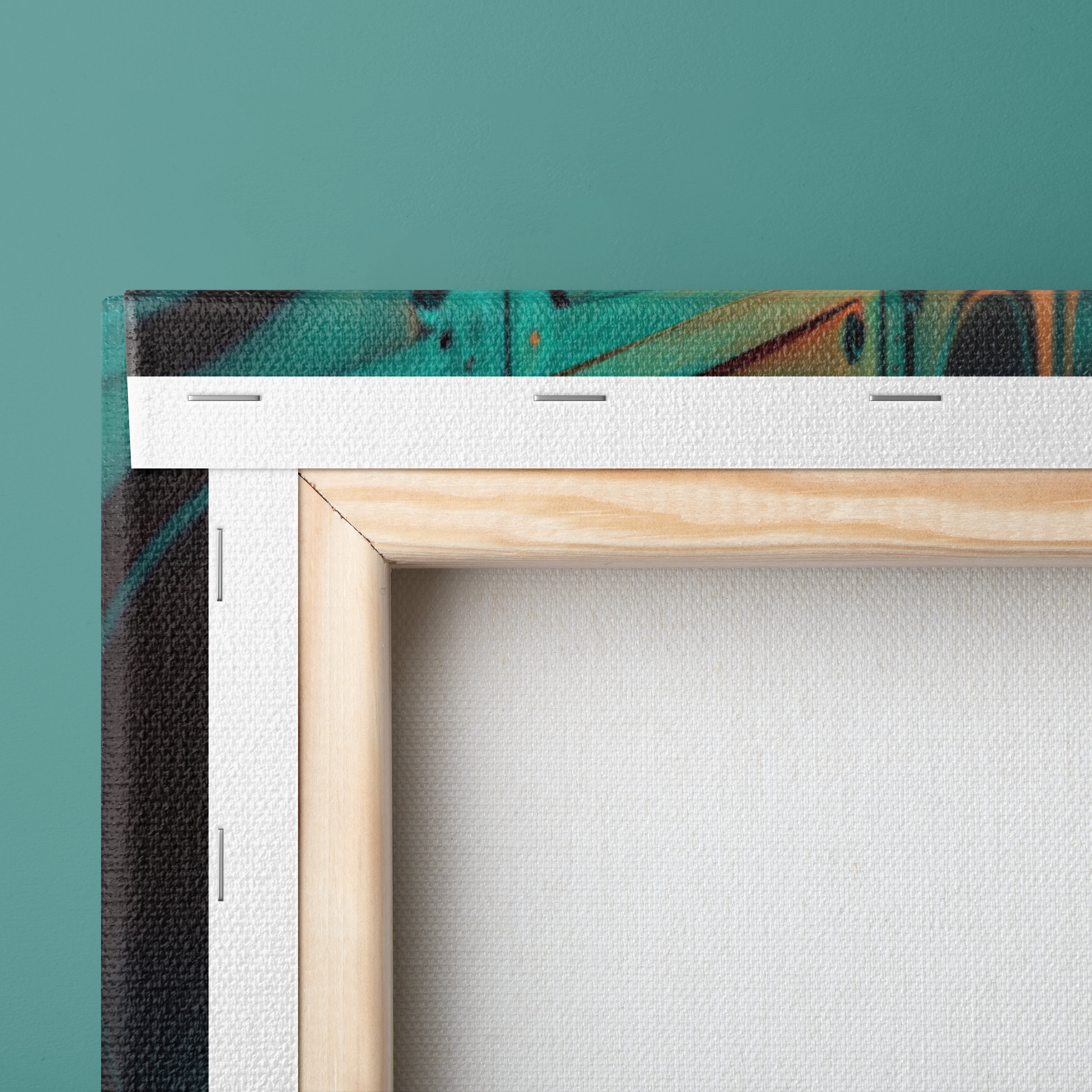 Each canvas is tightly folded and stapled on finger-jointed knotless European pine stretcher bars, with wedges for tension, using sustainably sourced wood for enduring strength and eco-friendly quality.
