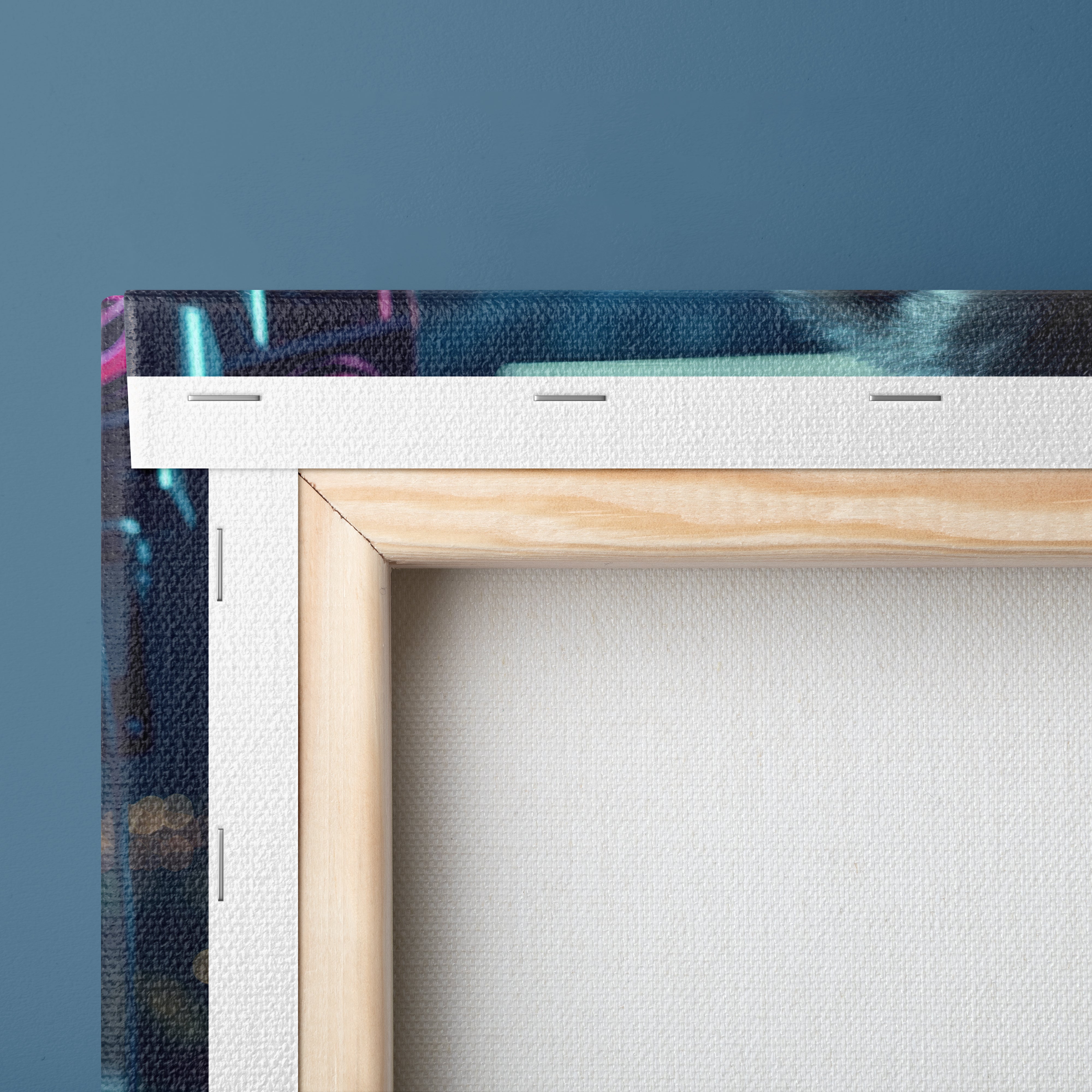 Each canvas is tightly folded and stapled on finger-jointed knotless European pine stretcher bars, with wedges for tension, using sustainably sourced wood for enduring strength and eco-friendly quality.